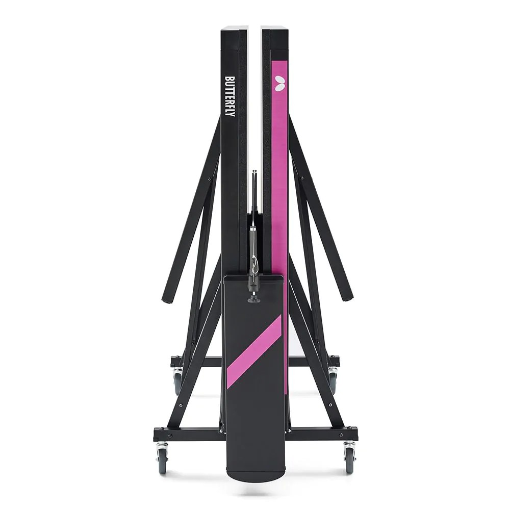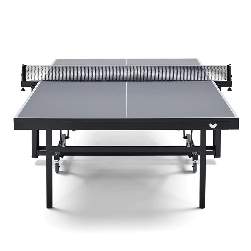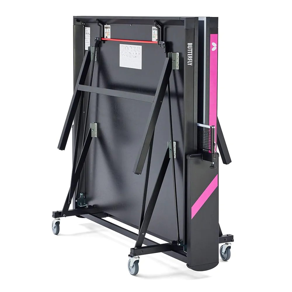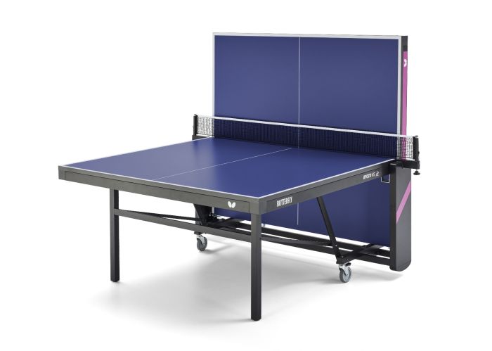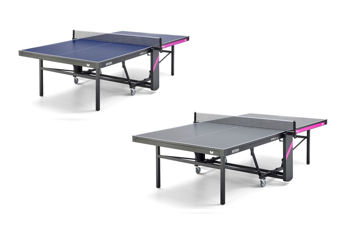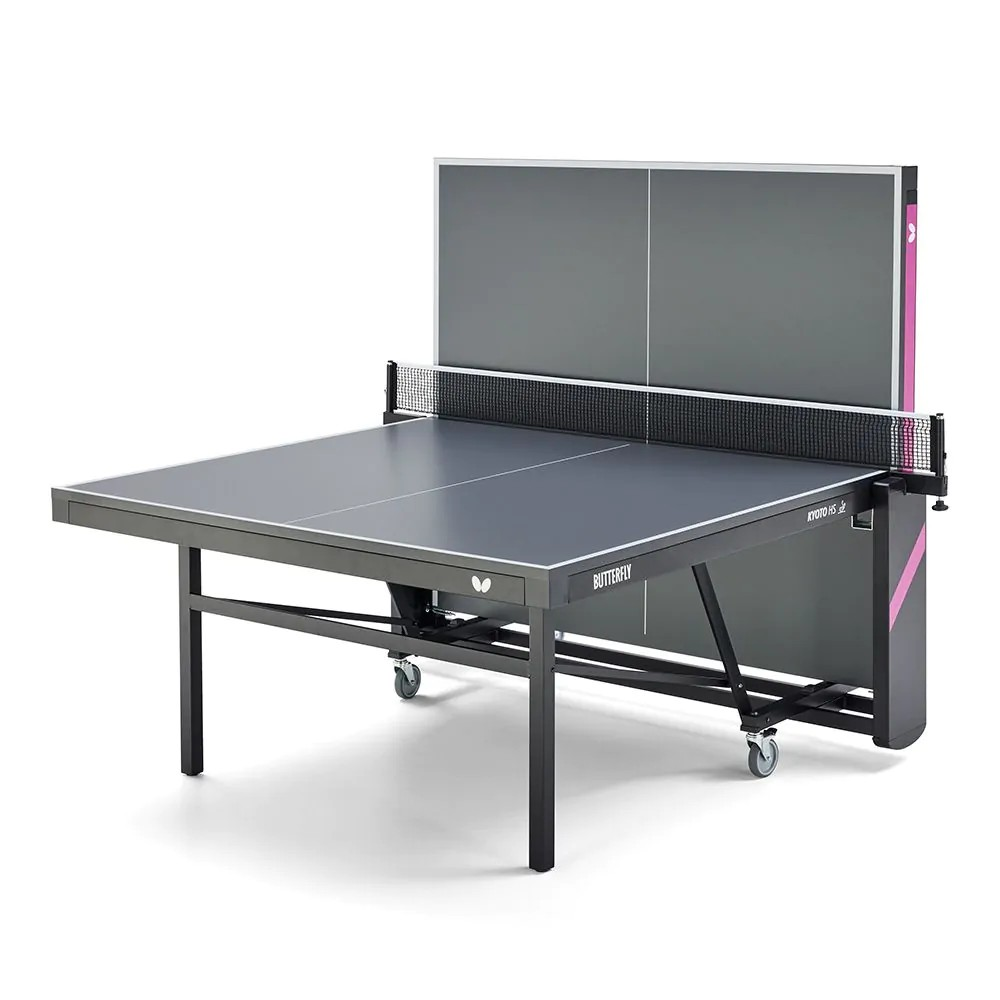 The Butterfly Kyoto HS is a compact table tennis table equipped with a high-quality, fixed net set. The special multi-coated 25mm surface has a very good bounce. Thanks to the ITTF approval, it can be used for competitive play, but also in schools, leisure facilities or in the private sector. The chassis is equipped with 4 swivelling wheels (diameter 100 mm with rubber tread), 2 of which have a parking brake. Height-adjustment glides on the rear stand legs ensure compensation for unevenness and different stand heights of up to 25 mm. The innovative bracket system with brackets under the frame profile unlocks both safety catches at the same time. The locking takes place automatically in the stop and playback position. The playback position also allows for individual training. The table must be assembled after delivery (2 individual boxes).